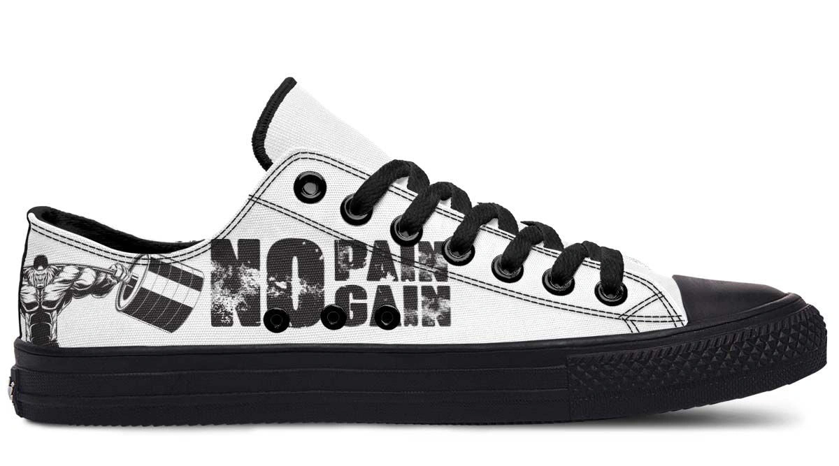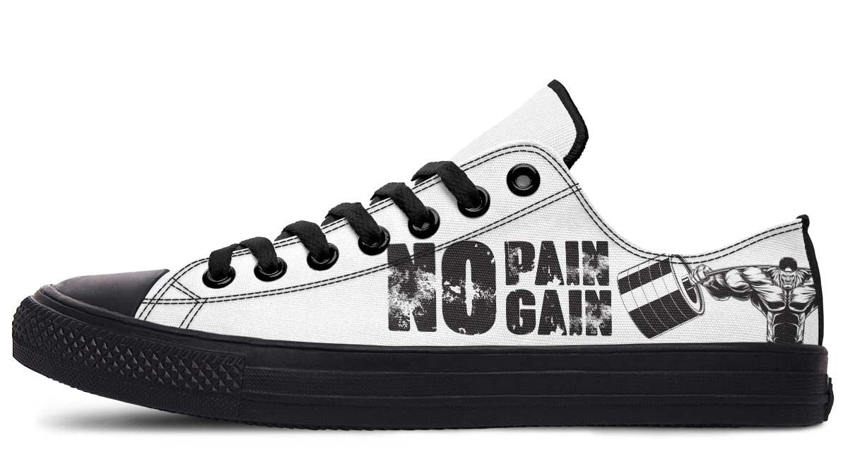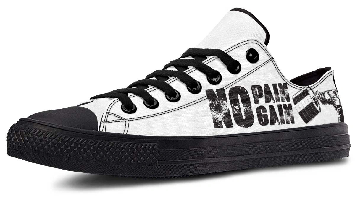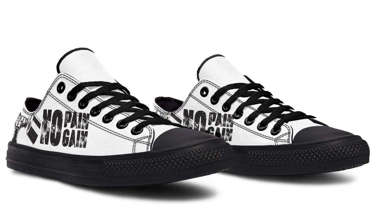 Wear your motivation with the No Pain No Gain White & Black Lowtop Sneakers. Featuring a classic monochrome palette, these sneakers are designed to inspire your best performance. The crisp white and black colorway makes them easy to pair with any athletic or casual outfit. With a focus on comfort and long-lasting wear, these shoes offer a supportive fit for high-intensity training or long days on your feet. Step into confidence and push your limits with this bold footwear choice.