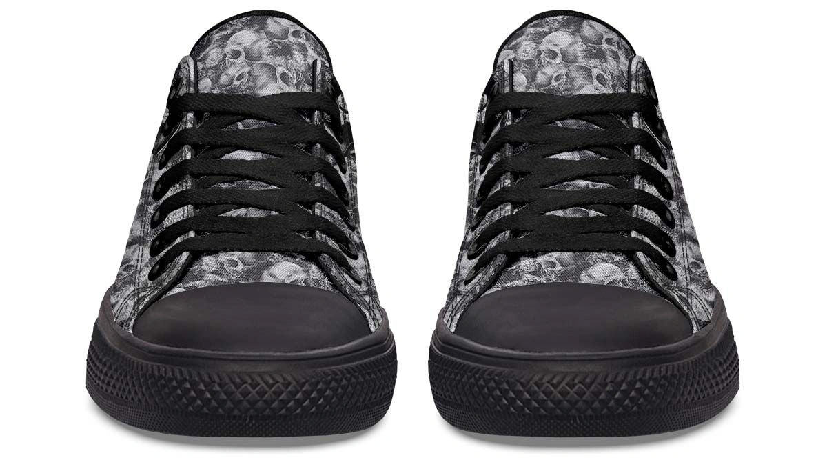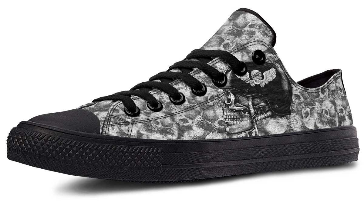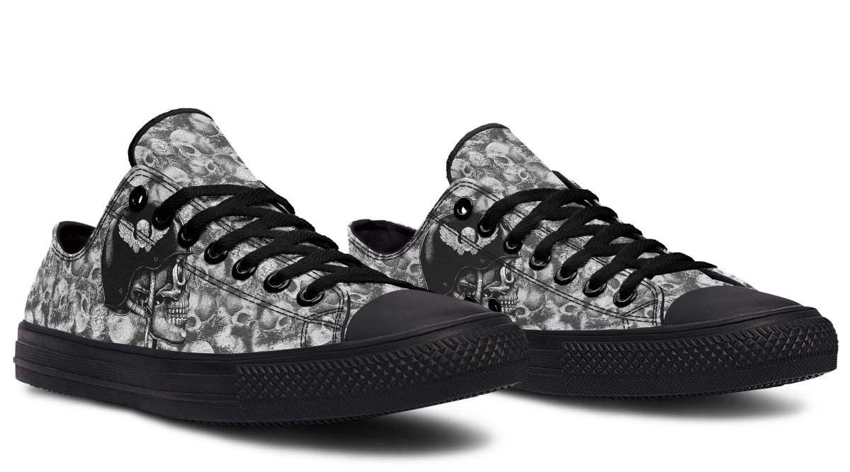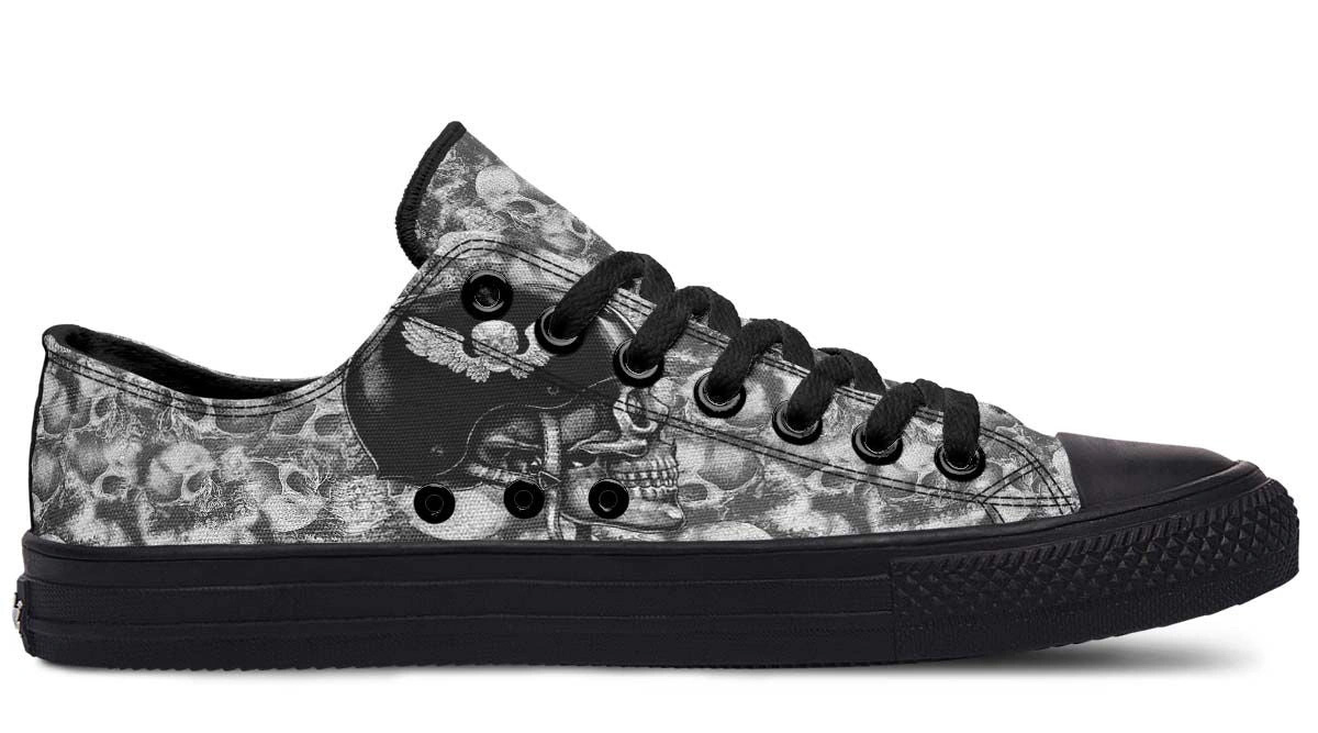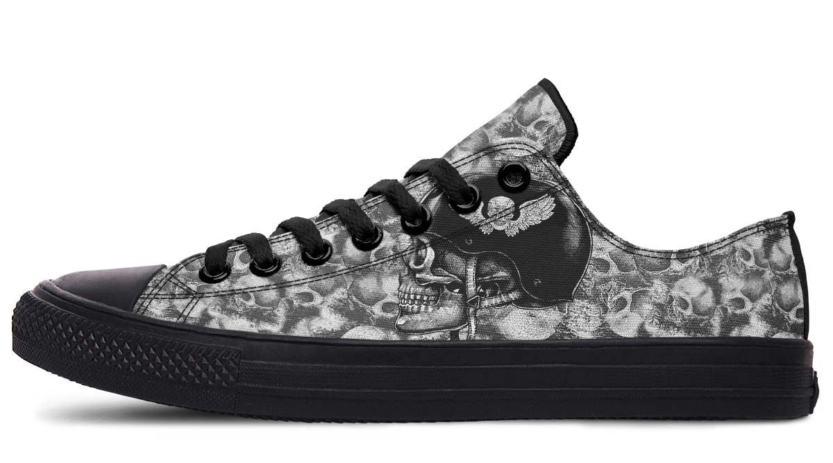 Step out with attitude in the Skull Rider Pattern Black Lowtop Sneaker. These edgy sneakers feature a bold skull rider graphic, making them a standout piece for any alternative or streetwear collection. Beyond the striking visual design, these shoes are engineered for comfort with a soft interior lining and a cushioned insole for all-day wearability. The sleek black finish and versatile low-top cut make them easy to pair with jeans or joggers. Whether you are hitting a concert or exploring the city, these durable sneakers provide the perfect mix of rebellion and comfort.